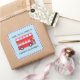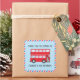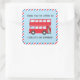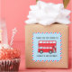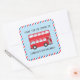 Thank you stickers with a red double decker bus inspired by the vintage London buses. Perfect for the London or bus themed birthday party. Blue, red and white stripes for decoration in the background. Personalise with your party message.