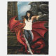 A black haired woman wearing sneaker, jeans and a tank top. The woman is holding a sword and a red dragon is beside her in the castle.