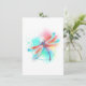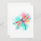 Red, flying, artistically drawn, in bright colours with textured iridescent, blue wings on white background, painted over with splashes of watercolor paint. Bright red dragonfly.