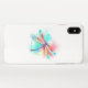 Red, flying, artistically drawn, in bright colours with textured iridescent, blue wings on white background, painted over with splashes of watercolor paint. Bright red dragonfly.