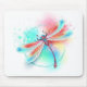 Red, flying, artistically drawn, in bright colours with textured iridescent, blue wings on white background, painted over with splashes of watercolor paint. Bright red dragonfly.