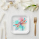 Red, flying, artistically drawn, in bright colours with textured iridescent, blue wings on white background, painted over with splashes of watercolor paint. Bright red dragonfly.