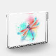 Red, flying, artistically drawn, in bright colours with textured iridescent, blue wings on white background, painted over with splashes of watercolor paint. Bright red dragonfly.