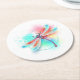 Red, flying, artistically drawn, in bright colours with textured iridescent, blue wings on white background, painted over with splashes of watercolor paint. Bright red dragonfly.