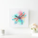 Red, flying, artistically drawn, in bright colours with textured iridescent, blue wings on white background, painted over with splashes of watercolor paint. Bright red dragonfly.