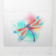 Red, flying, artistically drawn, in bright colours with textured iridescent, blue wings on white background, painted over with splashes of watercolor paint. Bright red dragonfly.