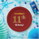 This simple, customised, birthday-themed paper plate design features a customisable message like "CustomName’s 11th Birthday!", where the name can be changed, and with the "11th" having a faux/imitation gold-like appearance. It also features a red coloured background. Paper plates like these could perhaps be used at a party being held to celebrate somebody’s eleventh birthday. [~Z0000144]