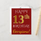 This simple, personalised birthday postcard design features the message "HAPPY 13th BIRTHDAY", with the "13th" having a faux gold-like appearance. The front also features a customised name, and a red background. The back features a custom birthday greeting message, along with the customisable address of the birthday postcard recipient. It could be sent to somebody who is celebrating their thirteenth birthday. [~Z0000071]