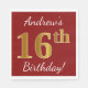 This simple paper napkin design features a message like "Andrew’s 16th Birthday!", with the "16th" having a faux gold-like appearance, on a red coloured background. The name can be personalised. It could be used at a birthday party for somebody who is celebrating their sixteenth birthday. [~Z0000080]