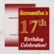 This birthday party invitation design features a message like "Samantha’s 17th Birthday Celebration!", where the name can be customised, and where the number "17th" has a faux gold-like appearance. It also features a red coloured background. The event details on the back can be customised. It could be used to invite people to somebody’s seventeenth birthday celebration or birthday party. [~Z0000120]