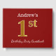 This guest book design features the ordinal number "1st" with a faux gold-like appearance. It also features a custom name, and a red coloured background. It could be used at a party for somebody celebrating their first birthday. [~Z0000055]