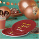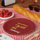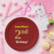 This simple, customisable, birthday-themed paper plate design features a customisable message like "CustomName’s 2nd Birthday!", where the name can be changed, and with the "2nd" having a faux/imitation gold-like appearance. It also features a red coloured background. Paper plates like these could perhaps be used at a party being held to celebrate somebody’s second birthday. [~Z0000144]