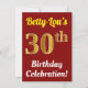 This birthday party invitation design features a message like "Betty-Lou’s 30th Birthday Celebration!", where the name can be customised, and where the number "30th" has a faux gold-like appearance. It also features a red coloured background. The event details on the back can be customised. It could be used to invite people to somebody’s thirtieth birthday celebration or birthday party. [~Z0000120]