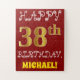 This fun and simple birthday puzzle design features the message "HAPPY 38th BIRTHDAY", with the "38th" having a faux/imitation gold-like colour appearance. It also features a custom name, and a red coloured background. It could be a fun and special way to deliver a personalised birthday greeting to somebody who is celebrating their thirty eighth birthday. [~Z0000200]