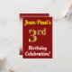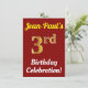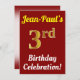 This birthday party invitation design features a message like "Jean-Paul’s 3rd Birthday Celebration!", where the name can be personalised, and where the number "3rd" has a faux gold-like appearance. It also features a red coloured background. The event details on the back can be personalised. It could be used to invite people to somebody’s third birthday celebration or birthday party. [~Z0000120]