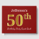 This guest book design features the ordinal number "50th" with a faux gold-like appearance. It also features a custom name, and a red coloured background. It could be used at a party for somebody celebrating their fiftieth birthday. [~Z0000055]