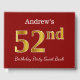 This guest book design features the ordinal number "52nd" with a faux/imitation gold-like appearance. It also features a custom name, and a red coloured background. It could be used at a party for somebody celebrating their fifty second birthday. [~Z0000055]