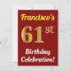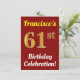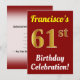 This birthday party invitation design features a message like "Francisco’s 61st Birthday Celebration!", where the name can be customised, and where the number "61st" has a faux gold-like appearance. It also features a red coloured background. The event details on the back can be customised. It could be used to invite people to somebody’s sixty first birthday celebration or birthday party. [~Z0000120]