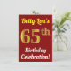 This birthday party invitation design features a message like "Betty-Lou’s 65th Birthday Celebration!", where the name can be personalised, and where the number "65th" has a faux gold-like appearance. It also features a red coloured background. The event details on the back can be personalised. It could be used to invite people to somebody’s sixty fifth birthday celebration or birthday party. [~Z0000120]
