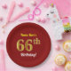 This simple, personalised, birthday-themed paper plate design features a customisable message like "Name-Here’s 66th Birthday!", where the name can be changed, and with the "66th" having a faux/imitation gold-like appearance. It also features a red coloured background. Paper plates like these could perhaps be used at a party being held to celebrate somebody’s sixty sixth birthday. [~Z0000144]