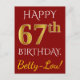 This simple, personalised birthday postcard design features the message "HAPPY 67th BIRTHDAY", with the "67th" having a faux gold-like appearance. The front also features a personalised name, and a red background. The back features a customised birthday greeting message, along with the customisable address of the birthday postcard recipient. It could be sent to somebody who is celebrating their sixty seventh birthday. [~Z0000071]