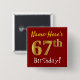 This simple square button design features a message like "Name-Here’s 67th Birthday!", with the "67th" having a faux/imitation gold-like coloring look, on a red colored background. The name can be personalized. Buttons like these could perhaps be worn by guests at a birthday party for somebody who is celebrating their sixty seventh birthday, where the party is being held in a large area with lots of other people present (such as a city park or a theme park). [~Z0000163]