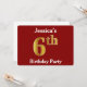 This invitation design features the ordinal number "6th" with a faux gold-like appearance. It also features a personalised name, and a red background. The event details on the back can be customised. It could be used to invite people to somebody’s sixth birthday party. [~Z0000012]