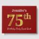 This guest book design features the ordinal number "75th" with a faux gold-like appearance. It also features a personalised name, and a red coloured background. It could be used at a party for somebody celebrating their seventy fifth birthday. [~Z0000055]