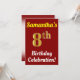 This birthday party invitation design features a message like "Samantha’s 8th Birthday Celebration!", where the name can be personalised, and where the number "8th" has a faux gold-like appearance. It also features a red coloured background. The event details on the back can be personalised. It could be used to invite people to somebody’s eighth birthday celebration or birthday party. [~Z0000120]