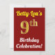 This birthday party invitation design features a message like "Betty-Lou’s 9th Birthday Celebration!", where the name can be personalised, and where the number "9th" has a faux gold-like appearance. It also features a red coloured background. The event details on the back can be customised. It could be used to invite people to somebody’s ninth birthday celebration or birthday party. [~Z0000120]