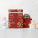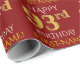This wrapping paper design features a message like "HAPPY 93rd BIRTHDAY", with the "93rd" having a faux/imitation gold appearance. It also features a name that can be personalised, and a red coloured background. It could perhaps be used when wrapping gifts being given for somebody’s ninety third birthday. [~Z0000131]