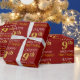 This wrapping paper design features a message like "HAPPY 9th BIRTHDAY", with the "9th" having a faux/imitation gold appearance. It also features a name that can be personalised, and a red coloured background. It could perhaps be used when wrapping gifts being given for somebody’s ninth birthday. [~Z0000131]