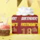 This wrapping paper design features a message like "FIRSTNAME’S 18th BIRTHDAY!", with the "18th" having a faux/imitation gold-like colour appearance, and with the name and "BIRTHDAY" in a fun, bold font. The name can be customised, and the background is coloured red. Wrapping paper like this could perhaps be used when wrapping birthday gifts being given to somebody in celebration of their eighteenth birthday. [~Z0000204]