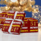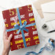 This wrapping paper design features a message like "SAMANTHA’S 51st BIRTHDAY!", with the "51st" having a faux/imitation gold-like colour appearance, and with the name and "BIRTHDAY" in a fun, bold font. The name can be customised, and the background is coloured red. Wrapping paper like this could perhaps be used when wrapping birthday gifts being given to somebody in celebration of their fifty first birthday. [~Z0000204]