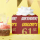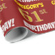 This wrapping paper design features a message like "GREGORY’S 61st BIRTHDAY!", with the "61st" having a faux/imitation gold-like colour appearance, and with the name and "BIRTHDAY" in a fun, bold font. The name can be personalised, and the background is coloured red. Wrapping paper like this could perhaps be used when wrapping birthday gifts being given to somebody in celebration of their sixty first birthday. [~Z0000204]