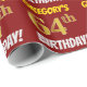 This wrapping paper design features a message like "GREGORY’S 64th BIRTHDAY!", with the "64th" having a faux/imitation gold-like colour appearance, and with the name and "BIRTHDAY" in a fun, bold font. The name can be personalised, and the background is coloured red. Wrapping paper like this could perhaps be used when wrapping birthday gifts being given to somebody in celebration of their sixty fourth birthday. [~Z0000204]