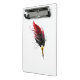 Artistically drawn, antique fountain pen embellished with dark red feather on white background.