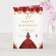 This elegant and glamorous birthday card can be personalized with a name or title such as daughter, granddaughter, niece, friend etc. The design features a beautiful princess with brunette hair and fair skin in a red ball gown. The text combines handwritten script and modern sans serif fonts for a classy and sophisticated look. The floral arrangements, butterflies and gold confetti create the perfect blend of rustic and chic.