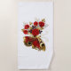 Red peacock eyed flower butterfly with red textured wing, decorated with composition of red, artistically painted roses with golden stems and leaves on white background.