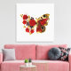 Red peacock eyed flower butterfly with red textured wing, decorated with composition of red, artistically painted roses with golden stems and leaves on white background.
