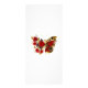 Red peacock eyed flower butterfly with red textured wing, decorated with composition of red, artistically painted roses with golden stems and leaves on white background.