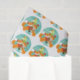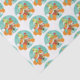 Holiday tissue paper with a white background, tiled design of two red foxes wearing winter hats and scarves in front of the decorated holiday tree on a circular background of aqua blue.