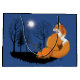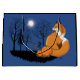 A red fox sits beside pumpkins and autumn leaves. Some Autumn leaves are flying towards the forest in behind the fox