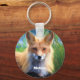 A personalised keychain with a beautiful wildlife image of a red fox laying down in green grasses. This cute creature has soft fur and gentle eyes. Image has a dreamy magical feel. Personalise with a name or initials.