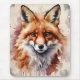 A bold watercolor depiction of a fox showcases its striking eyes and intricate fur patterns. The vibrant splashes of red and orange add energy and dynamism to the composition.