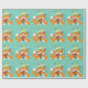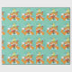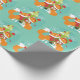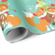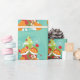 Cute and colourful holiday wrapping paper features two red foxes in earmuffs, winter hats, and striped scarves in front of a decorated Christmas tree with pretty white snowflakes.