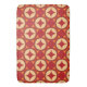 An artistic seamless pattern featuring red, orange, and beige geometric shapes forming interconnected circular and star motifs.