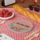 Red white gingham, tan burlap, rope in knots and featuring a cute shrimp.