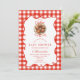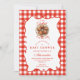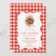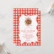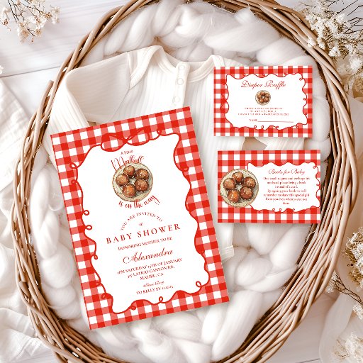 This playful red-gingham Baby Shower design brings all the cozy, nostalgic charm of a homemade family recipe. The hand-painted meatball illustration adds a fun, foodie twist, while the bold picnic-style border makes the whole layout feel warm, welcoming, and delightfully rustic. Perfect for moms-to-be who love cooking, comfort food themes, or hosting a shower with personality and heart. A standout choice for kitchen-themed celebrations and foodie families.