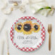 Red gingham wedding paper plates featuring sunflower flowers and string lights on a red chequered background. Matching items available to complement these rustic floral wedding paper plates. Easily personalise to any occasion.